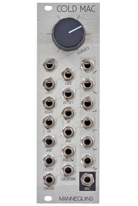 国内での取り扱いはないのですが、個人的に Mannequins の Cold Mac がオススメです。このモジュール、20個のジャックとノブが1個と一見何のモジュールなのかわからないのですが、各ジャックへのパッチングの仕方やノブの振る舞いによってロジック、パンナー/クロスフェード、インバータ、オフセット、エンベロープフォロワー、ユニティミキサー等として機能させることが出来ます。